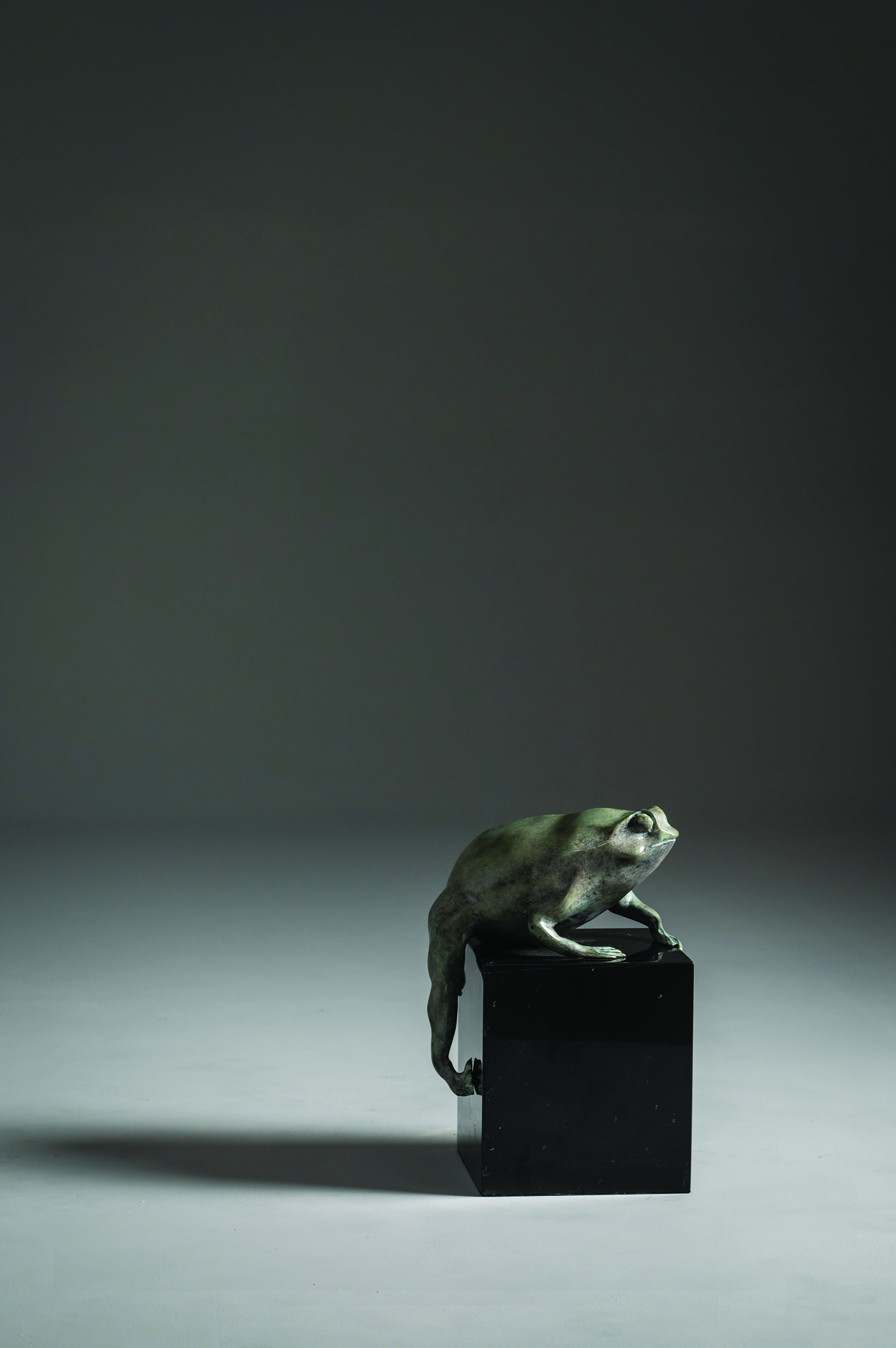 A friendly, chubby form with a cute little rear end; this cast-bronze frog creates amusement and happiness.
