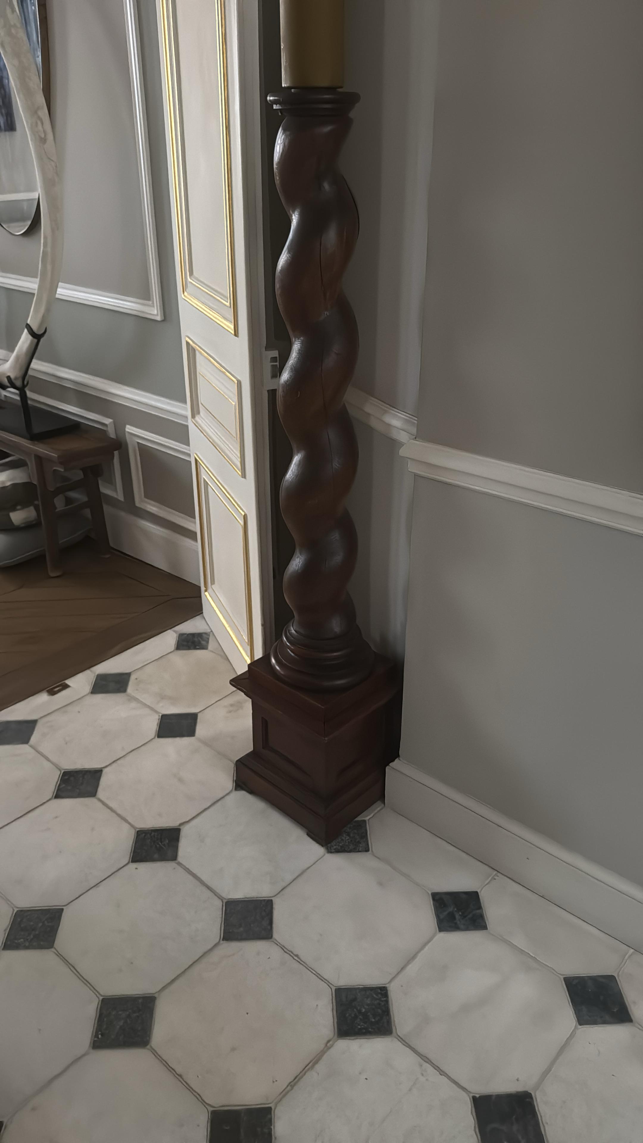 Solomonic columns proliferated in French and Italian churches during the Counter-Reformation, inspired by Bernini's St. Peter's baldachin (1624–1633). Torchières of this scale typically flanked altars or marked stations during Holy Week processions. The gilding remnants and wood selection (walnut or fruitwood, not cheaper pine) indicate ecclesiastical commission rather than domestic use.