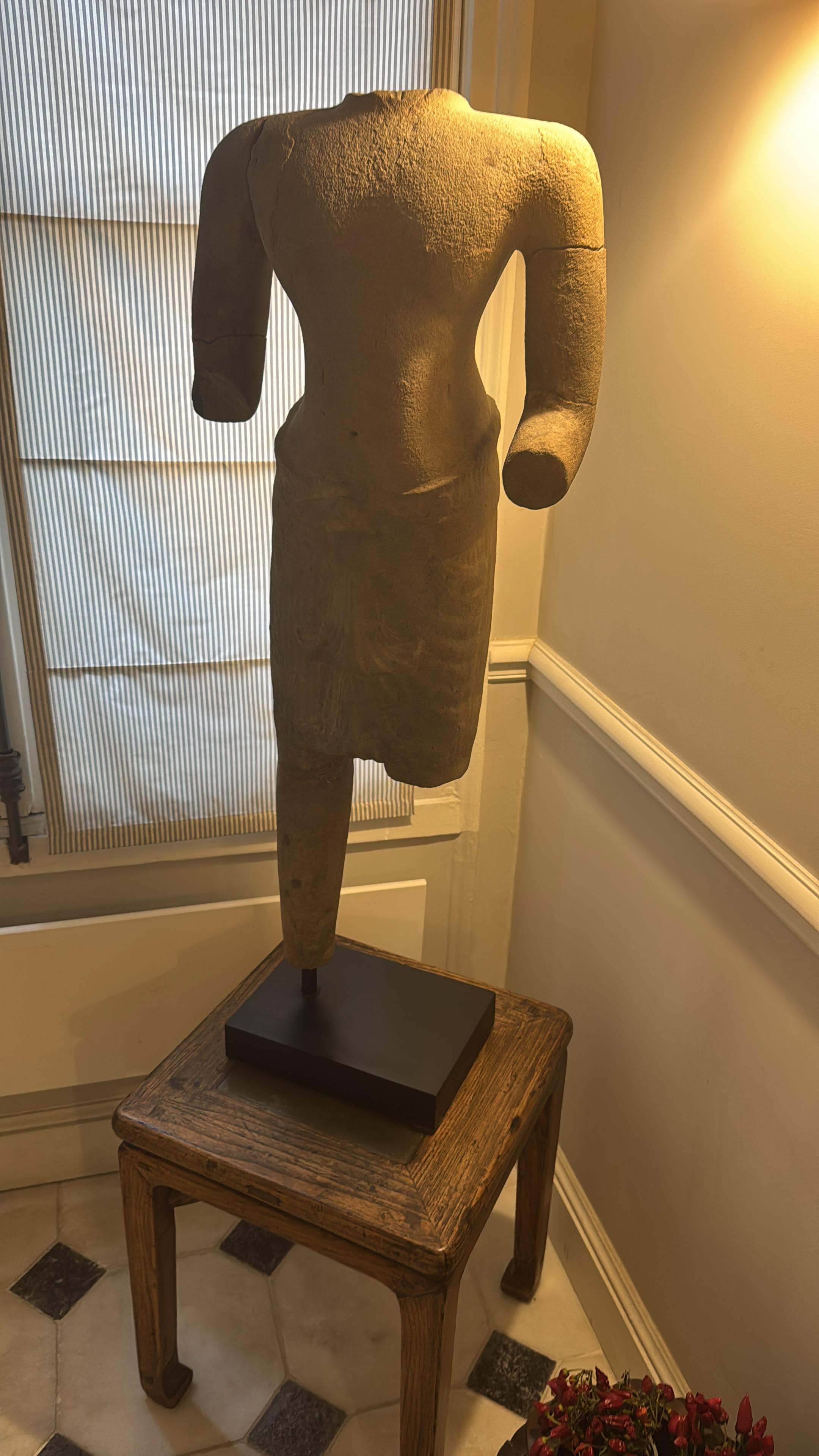 The proportions and carving style align with late Bayon period (c. 1200–1220), when workshops produced hundreds of celestial attendants and devas for King Jayavarman's building projects. The lime mortar repairs likely date to 13th–14th century, when temples remained active after the king's death. Comparable torsos: Musée Guimet, Paris (MG 17125) and Sotheby's New York (21 Mar 2019, lot 314, H 97 cm, $75,000–95,000).
