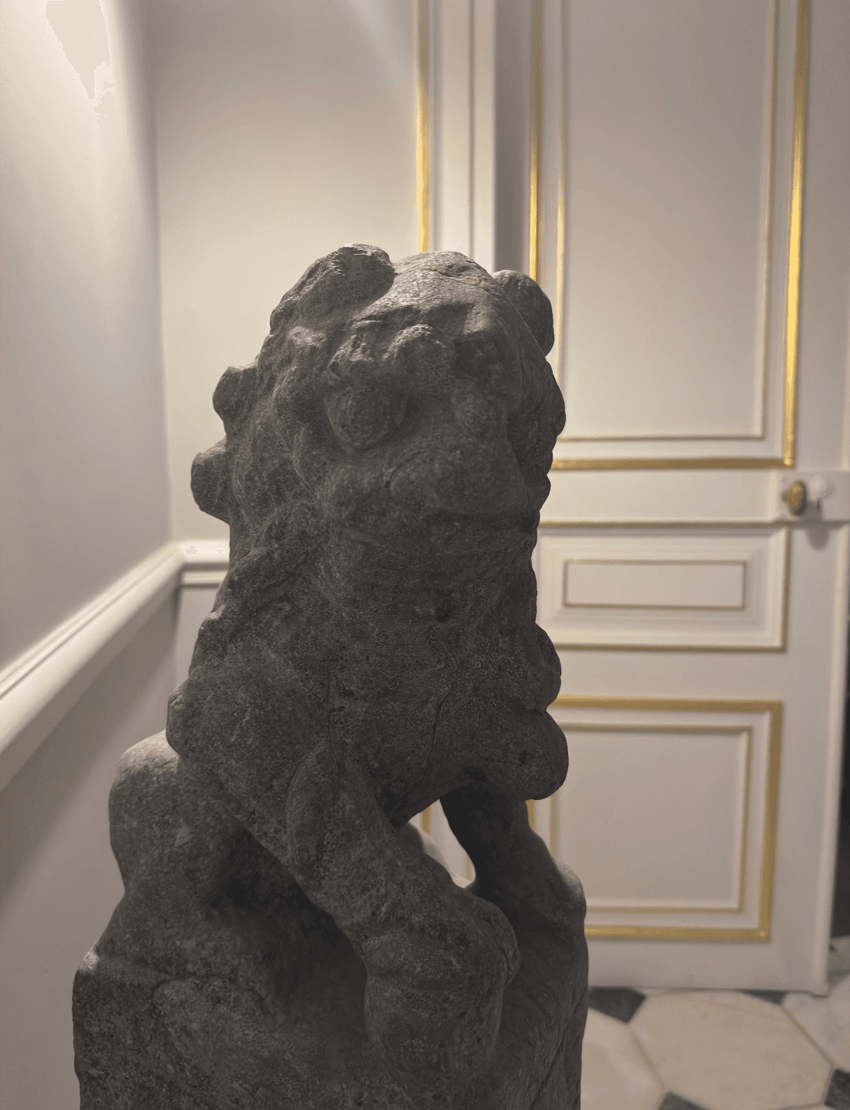 A pierced aperture near the base anchored tethering rings; the lion above served double duty as ornament and protector. The chalky patina, mottled with lichen, records centuries outdoors before entering interior collections—a shift from courtyard utility to sculptural presence.