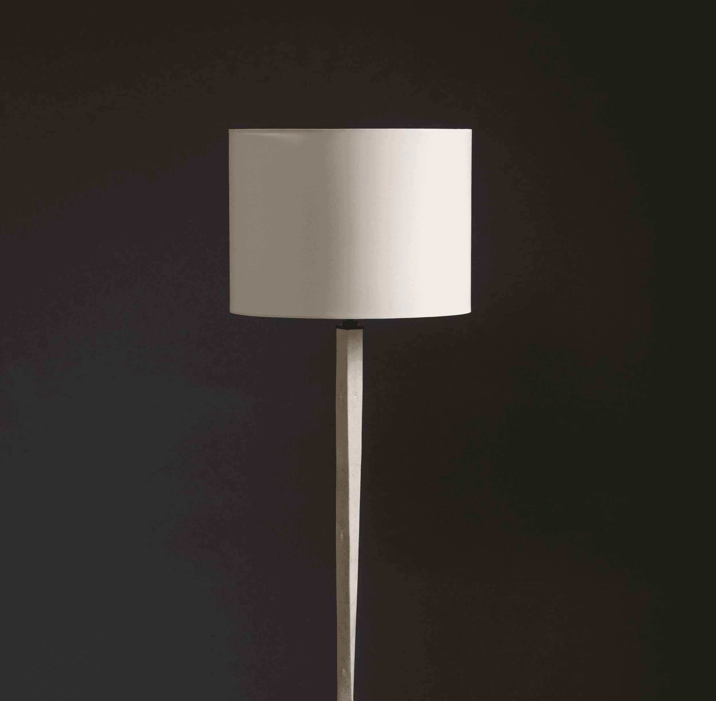 Tall, with a subtle twist and classical details. The Ural lamp design is singular and scaleless, like a vision of a lonely skyscraper far in the distance. Linen shade.
