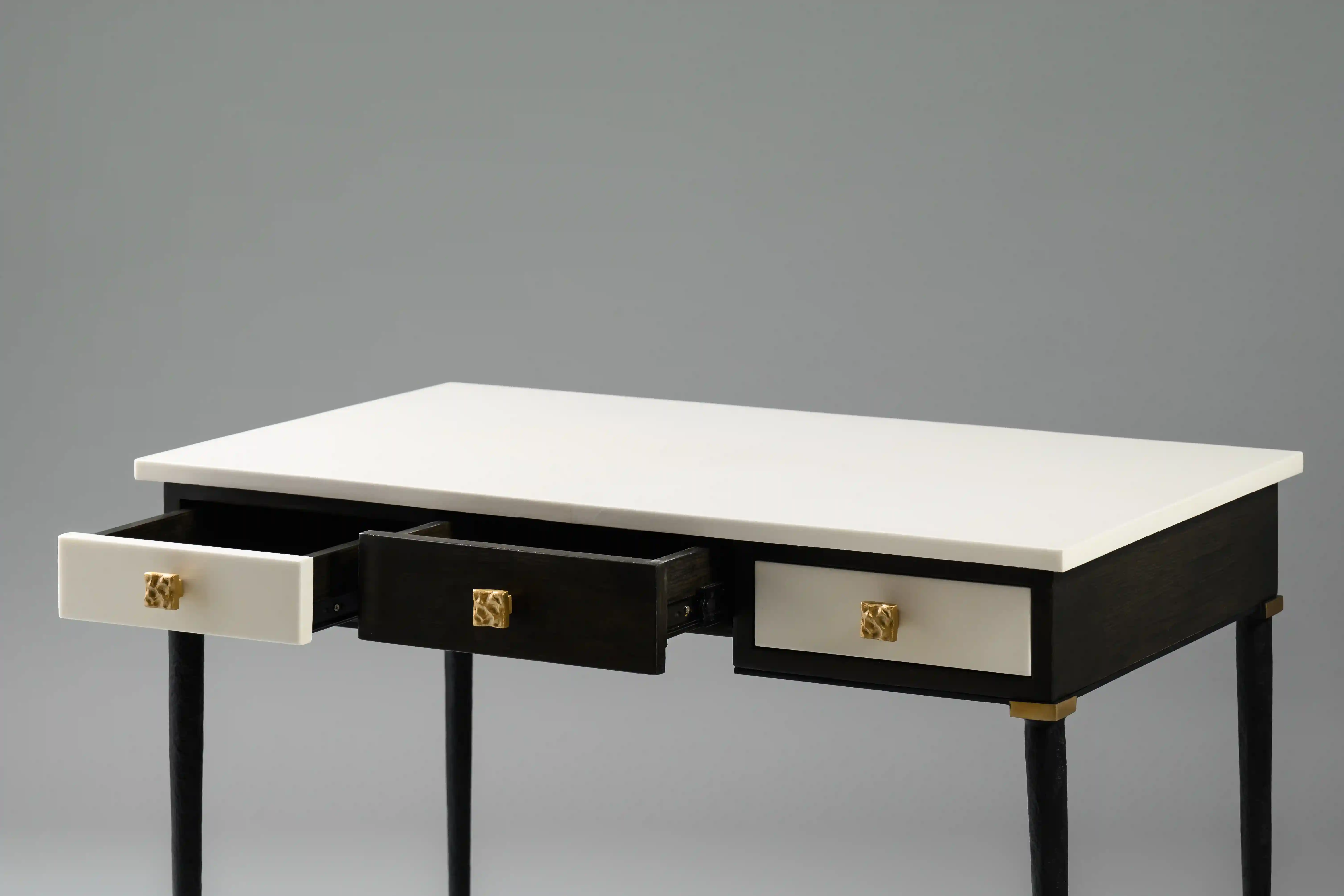 Ivory parchment with dark bronze base and antique gold bronze handles. Dark oak wood finishing.